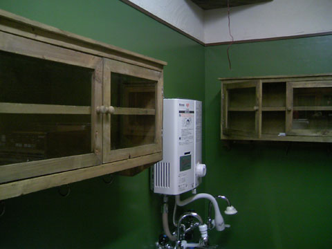 取り付け後、遠くから見てみると「なかなか良い感じに見える戸棚だな~」としばし自己満足(笑) しかしリサイクルウッドのためかかなり木の匂いがきついかも・・・。これは2~3日開けっ放しにしておく必要がありそうです。