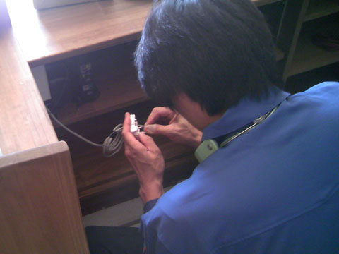 工事と言っても10分ぐらいのもので、店舗内では電話線の先にジャックを付けただけ・・・これは私でもできそう。しかしもう一人来られていたお兄さんはハシゴを使って電柱の線に何やら細工をされていたので、こちらが工事の本命のようです。