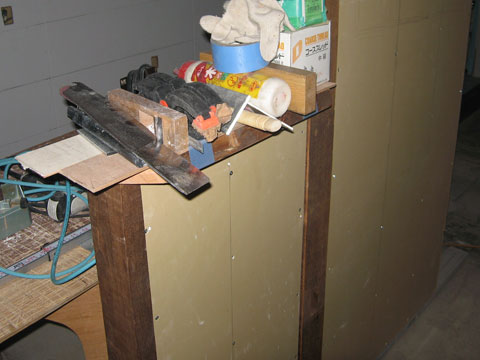 と言っても席を作ることは不可能なので本当に小さなカウンター台だけを作り、そこだけは厨房内と会話がしやすいように、また台の上にカップや皿を置けるようにしたものですが、実際に出来てきたモノ(と言っても仮組みで工具いっぱい載ってますが)を見ると、こういうスペースを作るだけでお店の中に解放感が間違いなく出そうです。