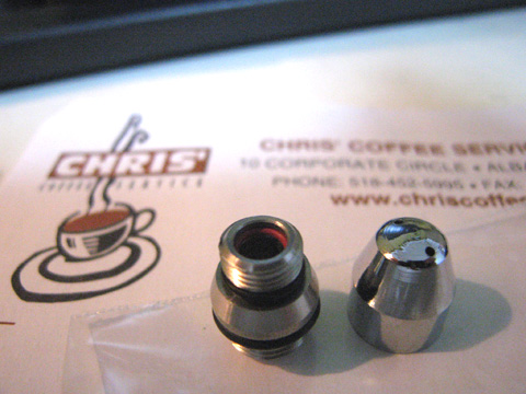で、その商品がエアメールで昨日郵便受けに届きました。注文から半月が過ぎましたがなんとか間に合った!という感じ。注文したのは小さな部品が2つだけなのですが、これでほんとにミルクの質が変わるのかな?と試してみると、確かに何回かに1度はsaecoのマシン同様のきめ細かいスチームミルクができることを確認できました。やはりチップでかなり変わるようですね~。あとは確実にこれが出来るようにするだけ!