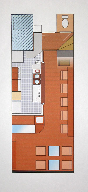 しかし今回大変だと思ったのはやはり物件の狭さ。はっきり何坪とはまだ言えませんが(図を見たらバレる?)、レイアウトを描きだすととにかく狭いことに気付きました。座席などはどうやっても10席も作れません。しかもトイレが微妙な場所にあるので必然的に厨房、通路の場所とスペースも決まってしまい、あとはどのように配置するかだけが問題になってきました。